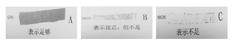 達因筆在材料表面上的擴散程度是由材料表面的清潔程度所決定的。材料表面的清潔程度如圖A中所示,材料表面沒有雜質,達因筆在材料表面涂抹后易流動和擴散,并涂滿了材料表面不平的表面。而在圖BC中,由于材料表面有雜質,達因筆涂抹后并不能和材料表面完全重合, 材料表面留有一定的空穴,達因筆在材料表面難以擴散。由于材料表面的清潔程度不同,達因筆與材料表面接觸的面積就不同,利用涂抹的面積大小就能檢測出材料表面的清潔程度,使用達因筆檢測是間接量化材料表面潔凈程度和表面處理效果的檢測方法。